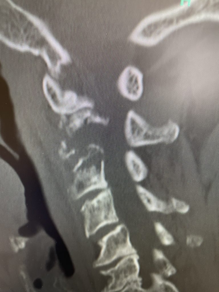 Fig 2: Sagittal CT scan demonstrating progression of disease into C3 vertebral body