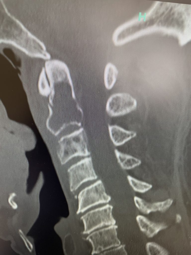 Fig 2: Sagittal CT scan demonstrating progression of disease into C3 vertebral body