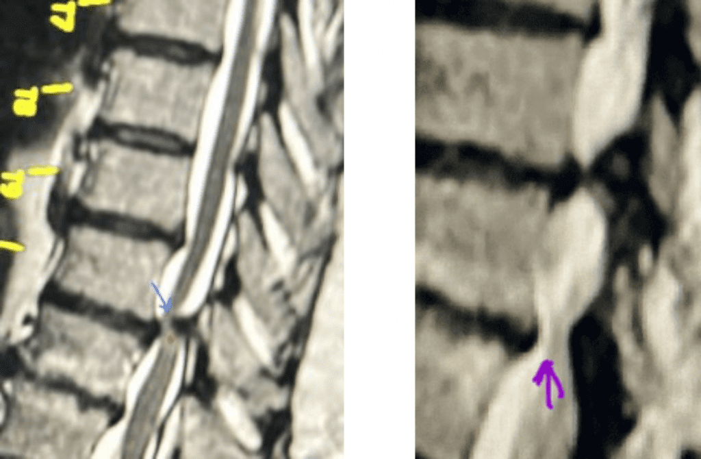 Figure 1. The sagittal MRIs demonstrate a very tight stenosis at T10-11 (blue arrow). Note the area of hyperintensity within the spinal cord at this level representing myelomalacia (red dot). Patient also has significant stenosis at T11-12 (purple arrow).
