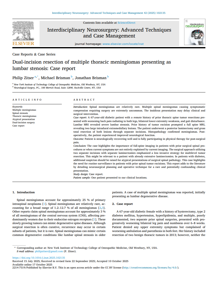 Dr. Brisman regularly collaborates with an experienced orthopedic spine surgeon to provide adult patients with operative care for complex spinal conditions. He routinely performs his surgeries at Lenox Hill Hospital/Northwell in Manhattan and NYU Langone on Long Island and in Manhattan, and at several Catholic Health System (CHS) hospitals on Long Island, including St. Francis Hospital and Mercy Medical Center in particular. He recently founded Manhattan -based Park Avenue Neurosurgery (an affiliate of NSPC Brain & Spine Surgery), a NYC practice dedicated to the minimally invasive surgical treatment of adult spinal conditions.