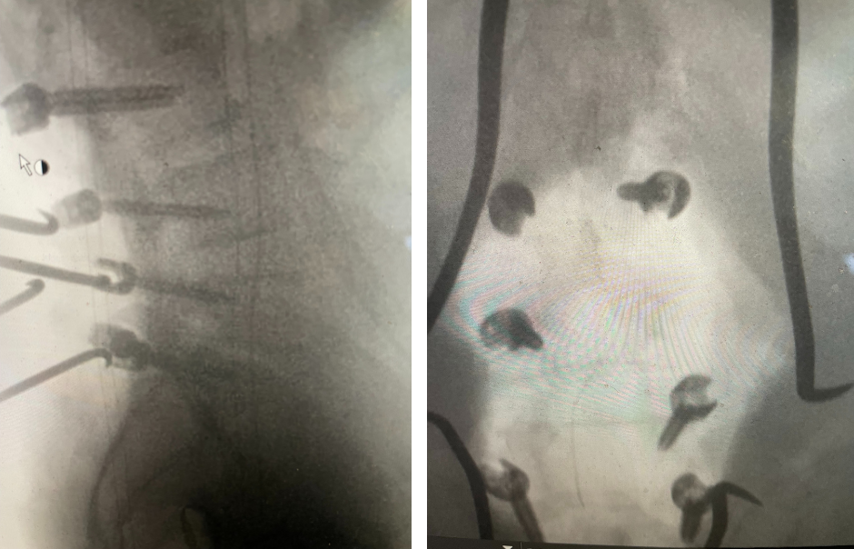 We decided to perform a lumbar decompression L2-S1 with an instrumented fusion. The patient intraoperatively had severe thecal sac compression with severe facet arthropathy and thickened ligamentum flavum. The patient had bilateral L5 pars defects with a floating L5 lamina. Because of these factors and the patient’s age, it was decided to place screws (Fig. 3). The patient did well postoperatively with relief of his lower extremity pain and weakness.