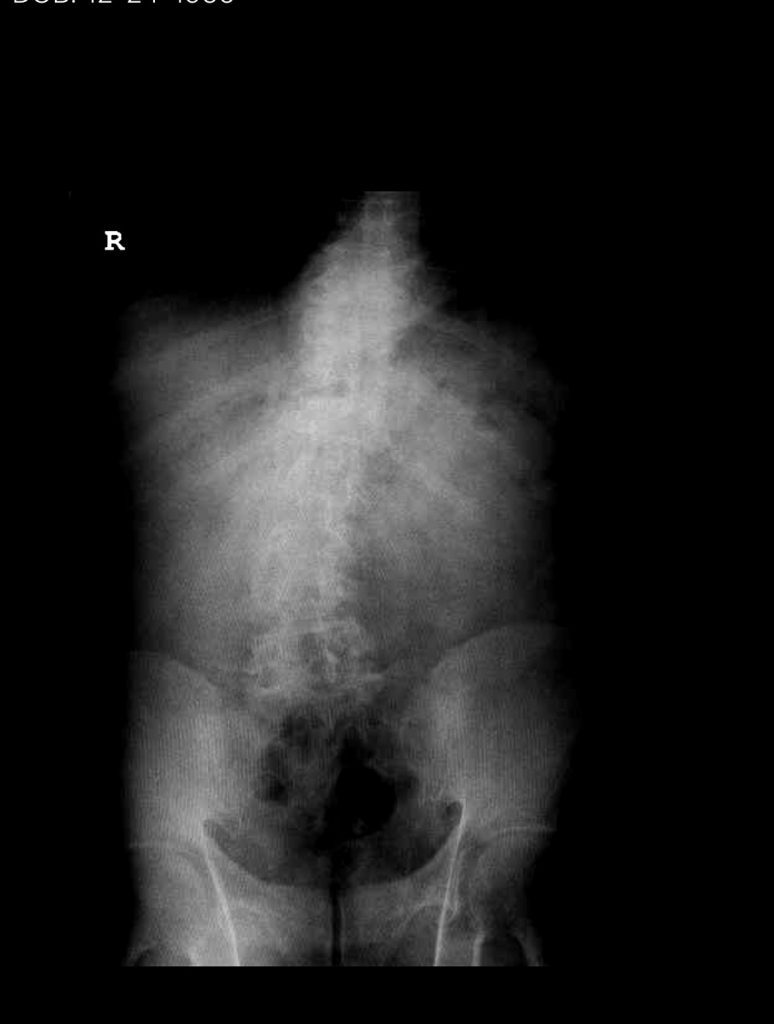 Figure 1. AP lumbar x-ray demonstrating degenerative lumbar levoscoliosis with secondary arthritic changes.