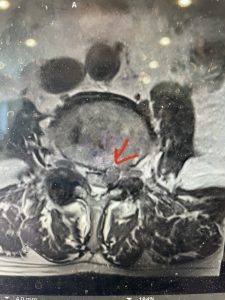 He had concentric severe stenosis with severe compression of the lateral recess and foramen at L3-4 secondary to the superimposed disc herniation. The fact that he had gotten worse with subtle cauda equina features with an extremely tight canal, he underwent a decompressive laminectomy. We also augmented his laminectomy with an in situ fusion from L3-5 as he was relatively young, with more time to reform arthritis, and had been unstable enough to extrude a disc fragment. By placing “bone dust” or bone material along the sides of the spine, specifically laying it across the transverse processes after they have been drilled to bleeding bone, you provide an environment where bone formation is induced to connect the segments, stabilize them, and thereby reduce the signal to make more arthritis as that signal is still present despite the laminectomy. What was interesting was that we encountered a large extruded disk fragment that was significantly contributing to his compression which is often not found in patients in this age bracket. Post operatively he had much improvement of leg pain.