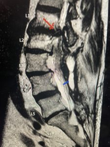 (Figs 5a): Sagittal (a) and axial (b) T2-weighted lumbar MRI demonstrating status post lumbar decompression and insitu fusion L2-5 now well decompressed (blue dash) with development of new (red arrow) severe stenosis and with superimposed right L1-2 disc herniation (blue arrow)