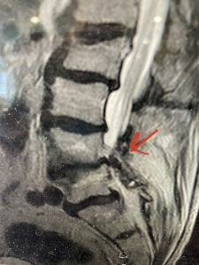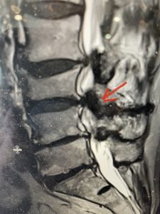 He had concentric severe stenosis with severe compression of the lateral recess and foramen at L3-4 secondary to the superimposed disc herniation. The fact that he had gotten worse with subtle cauda equina features with an extremely tight canal, he underwent a decompressive laminectomy. We also augmented his laminectomy with an in situ fusion from L3-5 as he was relatively young, with more time to reform arthritis, and had been unstable enough to extrude a disc fragment. By placing “bone dust” or bone material along the sides of the spine, specifically laying it across the transverse processes after they have been drilled to bleeding bone, you provide an environment where bone formation is induced to connect the segments, stabilize them, and thereby reduce the signal to make more arthritis as that signal is still present despite the laminectomy. What was interesting was that we encountered a large extruded disk fragment that was significantly contributing to his compression which is often not found in patients in this age bracket. Post operatively he had much improvement of leg pain.