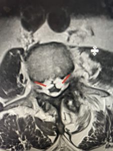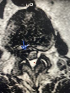 (Figs 5a): Sagittal (a) and axial (b) T2-weighted lumbar MRI demonstrating status post lumbar decompression and insitu fusion L2-5 now well decompressed (blue dash) with development of new (red arrow) severe stenosis and with superimposed right L1-2 disc herniation (blue arrow)