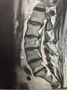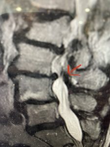 (Fig 2) Sagittal T2-weighted lumbar MRI demonstrating (arrow) tight lateral recess stenosis