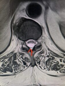 Fig. 1b Axial T2-weighted thoracic MRI demonstrating spinal cord compression from T10-11 arachnoid cyst (red arrow)