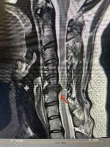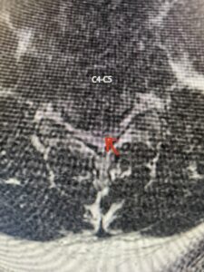 Fig: 2b Axial T2-weighted cervical MRI demonstrating spinal cord compression from C4-5 herniated disc (red arrow)