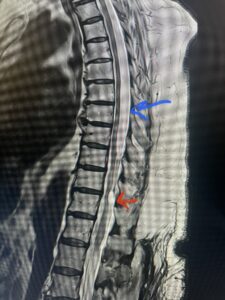 Fig. 1 Sagittal T2-weighted thoracic MRI demonstrating both T10-11 focal intradural arachnoid cyst (red arrow) and larger upper thoracic cyst that appears to extend from T4-T8 (blue arrow).