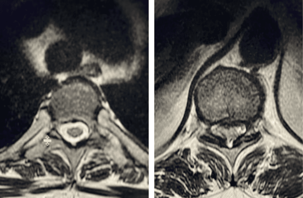 Figure 2. Axial images comparing a normal appearing spinal cord with a white fluid ring around it versus an axial image of the T10-11 level demonstrating circumferential stenosis.