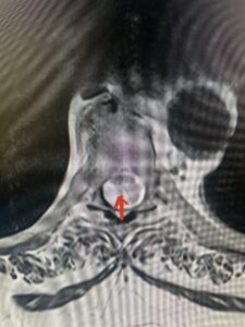 Fig: 2b Axial T2-weighted cervical MRI demonstrating spinal cord compression from C4-5 herniated disc (red arrow)